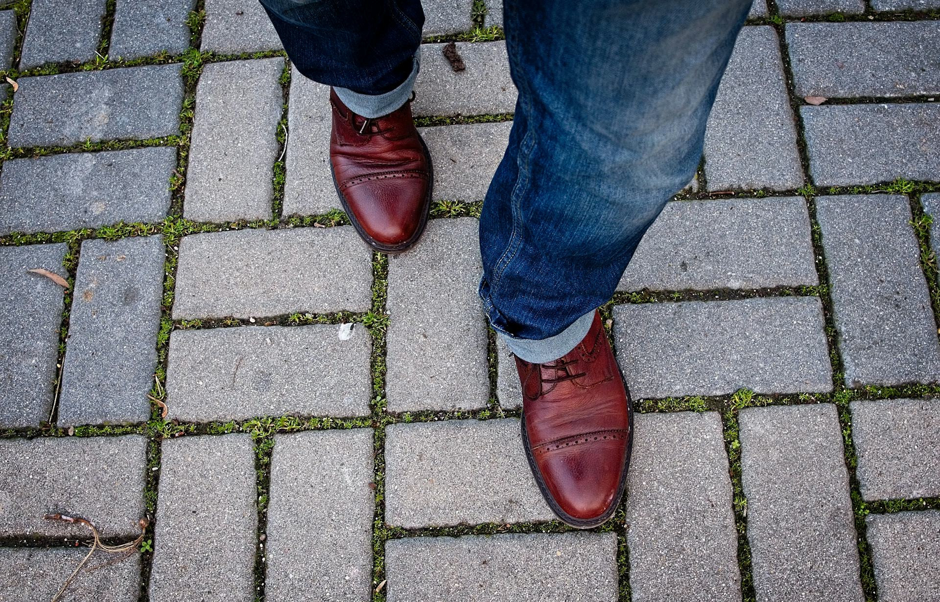 - Gerade geschnittene Jeans funktionieren gut, wenn sie genau bis zur Oberkante des Schuhs reichen.